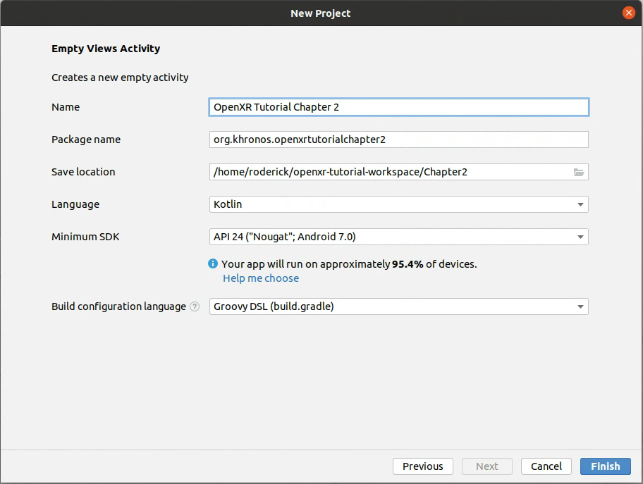 Set the Name to ‘OpenXR Tutorial Chapter 2’, the Package name to org.khronos.openxrtutorialchapter2 and save location to that Chapter2 folder. The language can be ignored here as we are using C++, and we can set the Minimum SDK to API 24: Android 7.0 (Nougat) or higher. If a “Build Configuration Language” option is shown, set this to Groovy DSL (build.gradle). Click “Finish” to complete the set up.