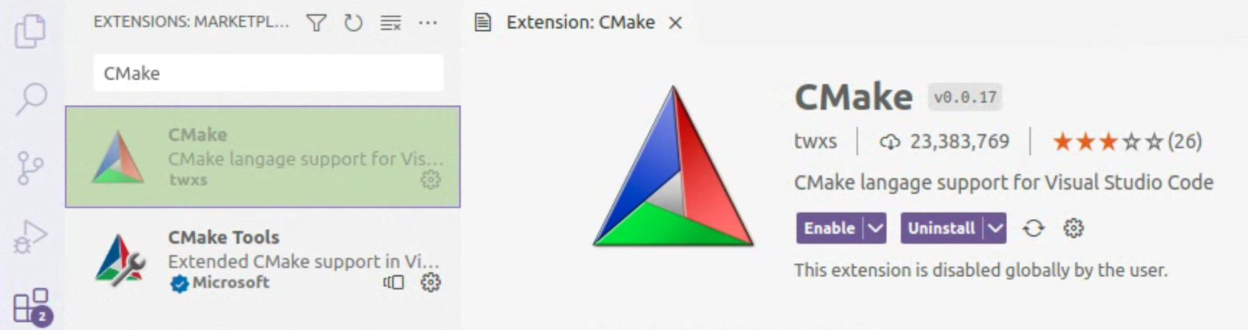 If you haven’t previously done so, install the CMake extension for Visual Studio Code: select the “Extensions” tab, and type “CMake” in the search box.